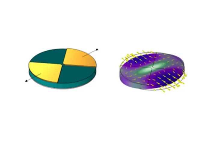 Another interesting mode shape is wine glass mode resonance where a combination of radial and tangential displacements contributes to the mode shape. Although it is possible to transduce this mode with segmented electrodes (Figure 1) that partially match the strain profile of the disk resonator, unavoidable misalignment problem causes spurious modes to appear.